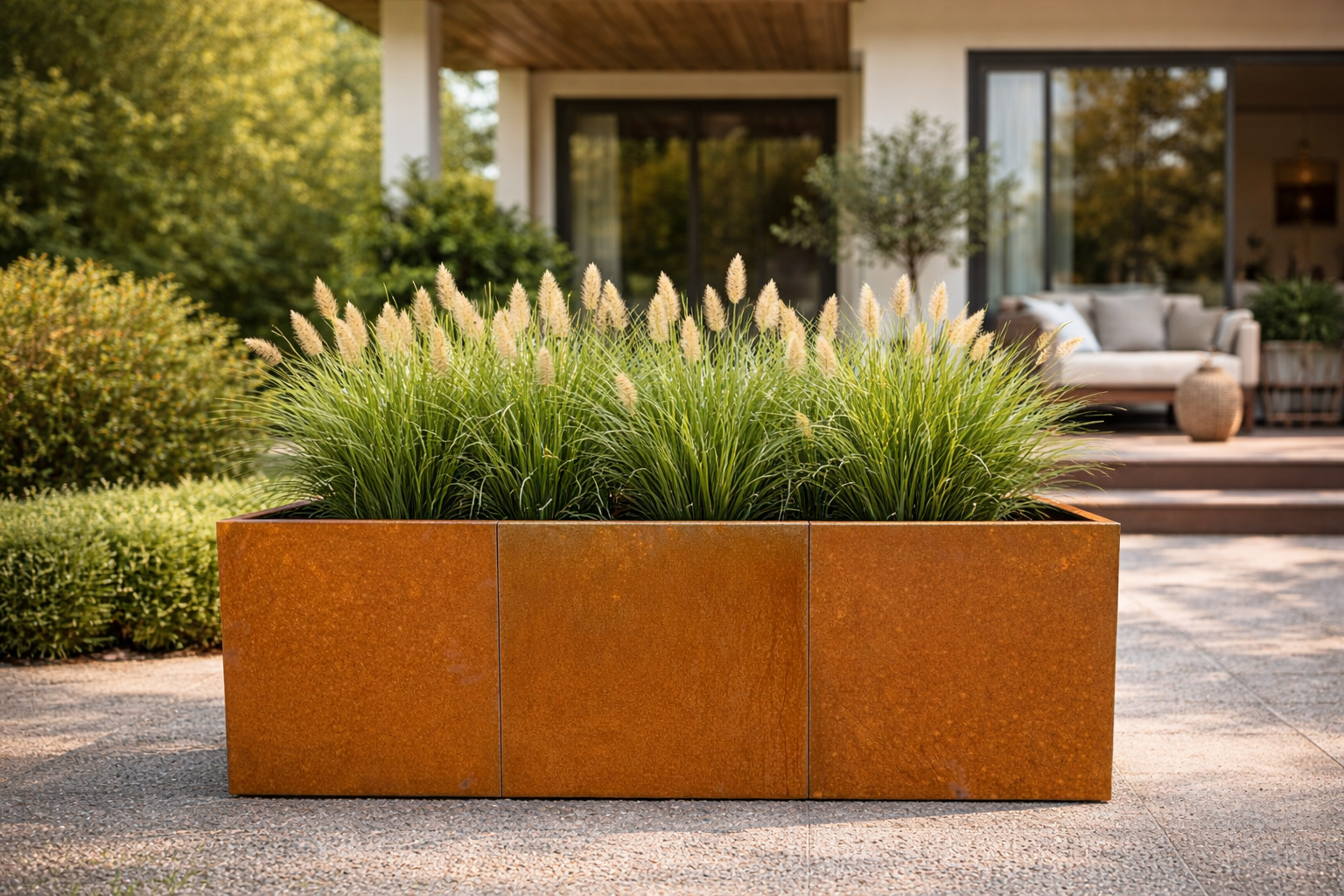 Upptäck Recals blomlådor i cortenplåt, perfekta för att ge din trädgård eller offentliga miljö en elegant och designad touch. Tillverkade med en tjocklek på 1,5 mm, garanterar dessa blomlådor hållbarhet och stabilitet under lång tid framöver.