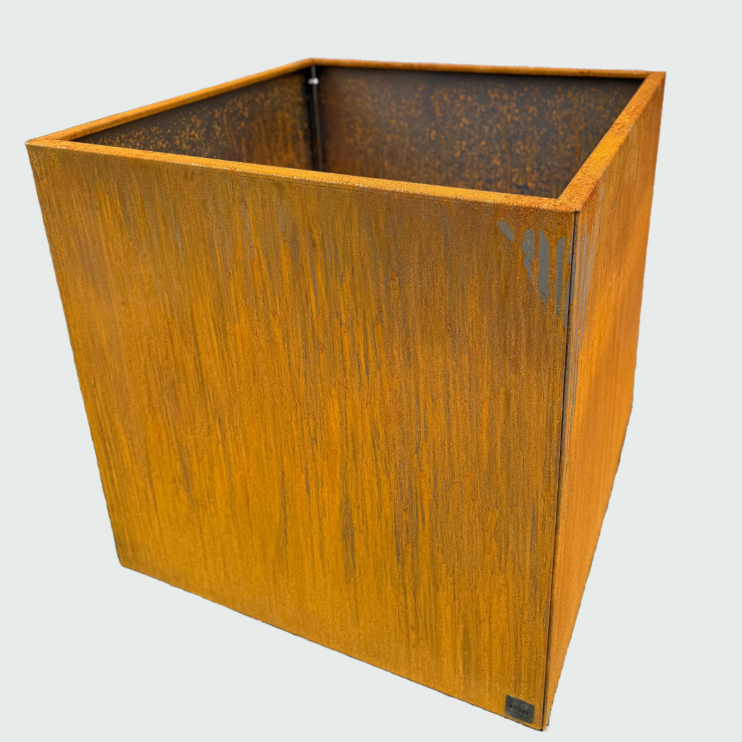 Efter några veckor utomhus kommer den rostiga ytan fram på plåten. Blomlådan är behandlad vid leverans, det rekommenderas därför att du tvättar av den med såpa och vatten för att påskynda processen för att få fram den rostiga ytan på cortenstålen.