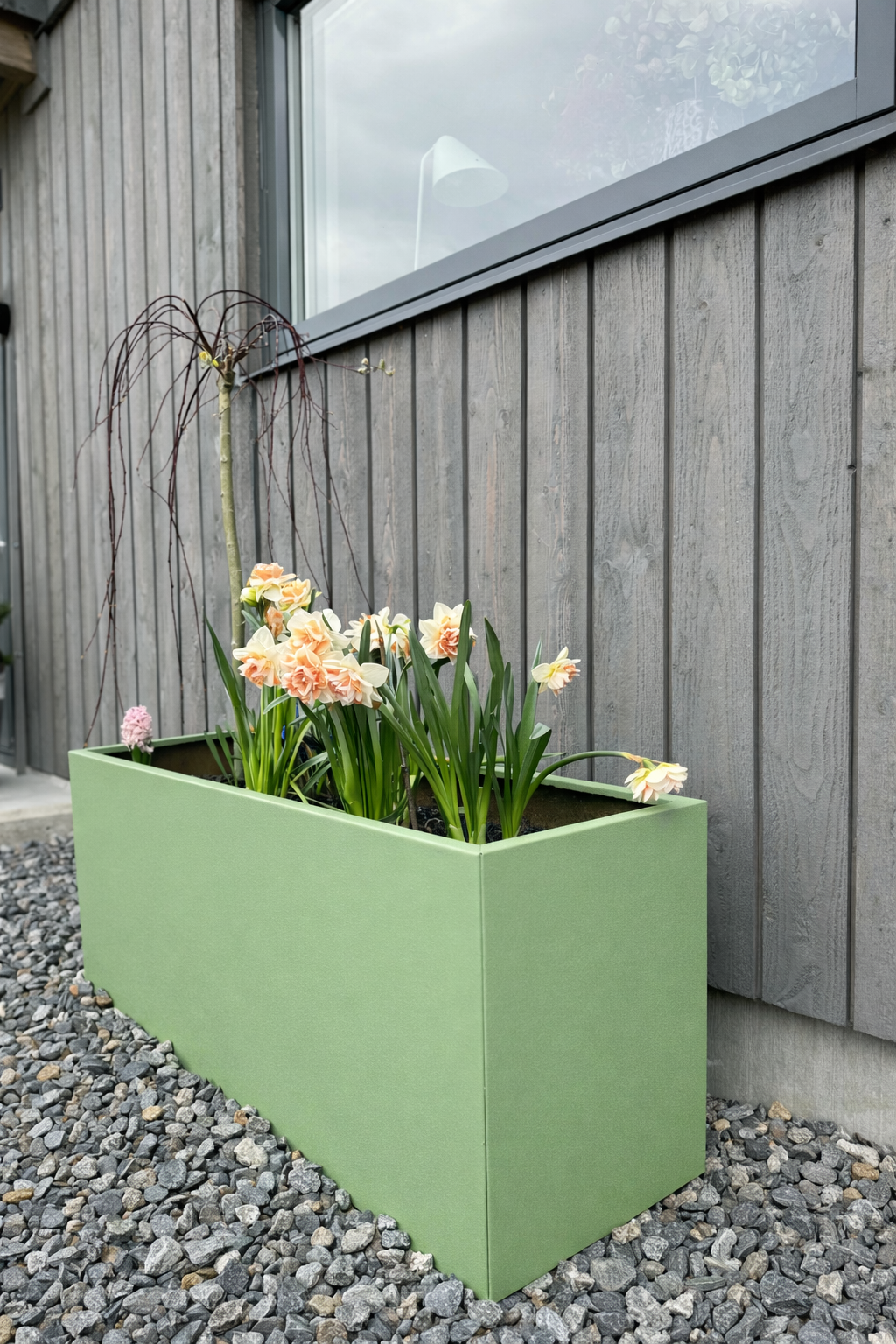 Recals Vårgröna planteringskärl i storlek 120x40x50cm med en tjocklek på 1,5mm med dubbelbockad överkant och botten, tillverkad i Sverige!
