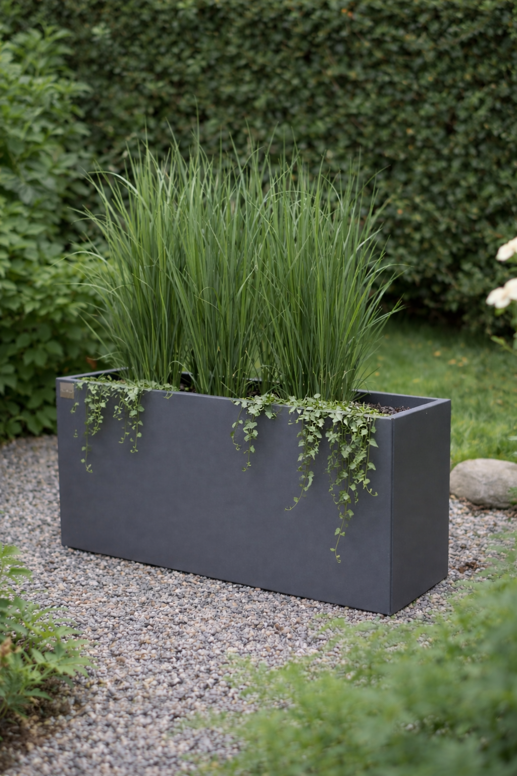 Men en levande utemiljö handlar också om vad du planterar. För att dina blomlådor ska se snygga ut året runt i vårt klimat, rekommenderar vi en bas av vintergröna växter. Buxbom, dvärgtallar eller olika typer av gräs behåller sin struktur även när snön faller. På våren och sommaren kan du sedan enkelt komplettera med säsongsblommor för att få in färg. Genom att kombinera underhållsfria kärl med tåliga växter skapar du en design som ser exklusiv ut 365 dagar om året.